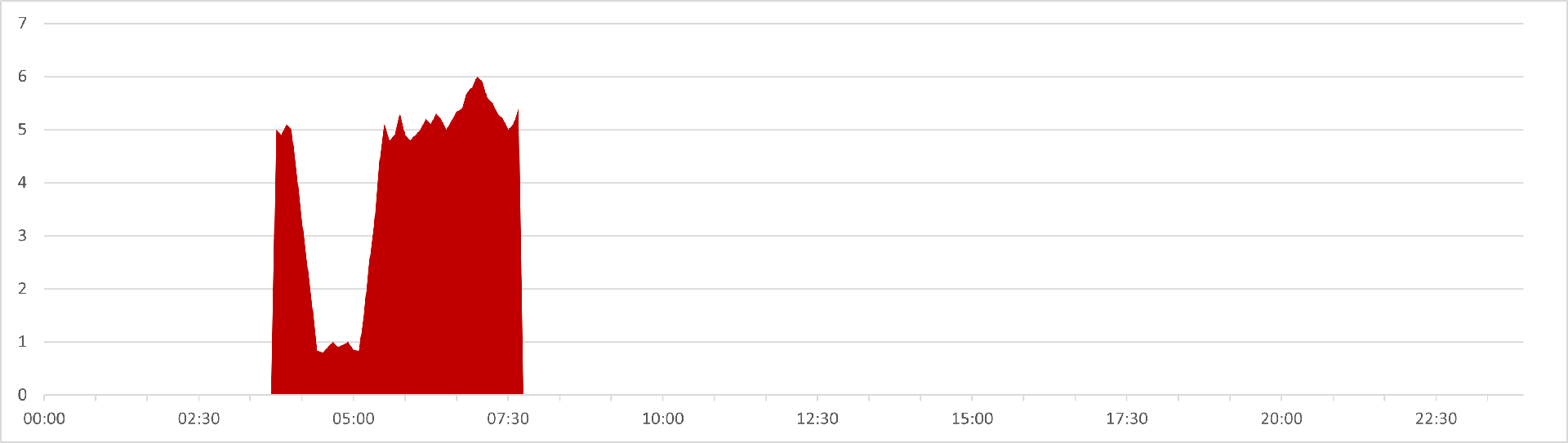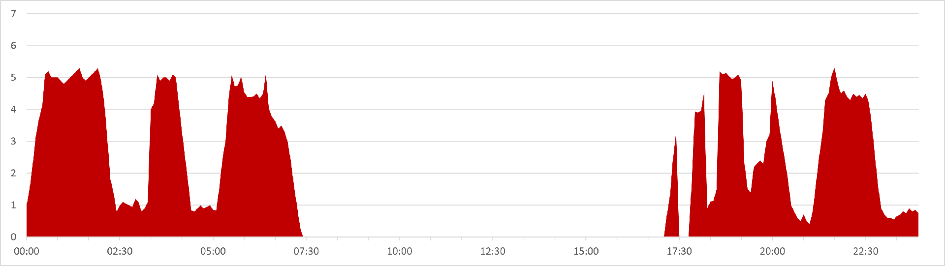 Votre consommation, elle, est tout autre. Le matin et l’après-midi, la maison est souvent vide. À midi, la consommation augmente brièvement pour le repas. Mais les besoins importants d’énergie arrivent surtout en fin de journée – précisément au moment où la production solaire diminue fortement.